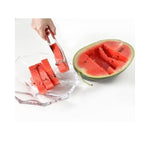 • Wire blade cuts the watermelon to straight slices. Then, flip the tool over and use the curved side like a pair of tongs to extract the watermelon from the rind.